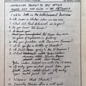 Karen Finley. Impressive to say after having sex and you’re in the art world. Coagula Art Journal. Number 33. Sunland, California: Mal Gleason, May 1988, page 23. (Karen’s Komix or Finley’s Funnies)