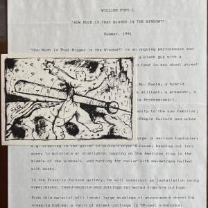 (William Pope.L). How Much Is That Nigger In the Window by William Pope.L. Performance/Installation. Franklin Furnace installation til 7/30/[1991] / street performances til 7/30/[1991] / Knitting Factory 7/23. Franklin Furnace 7/30