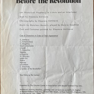 (Eleanor Antin). “Before the Revolution.” (A Historical Prophecy in 3 Acts and an Interlude). Book by Eleanora Antinova. Choreography by Eleanora Antinova. Music by Monsieur Mozart, played by Marcia Goodman. Cast and costumes painted by Eleanora Antinova. Presented by The Kitchen Center in Association with Ronald Feldman Fine Arts [1979]