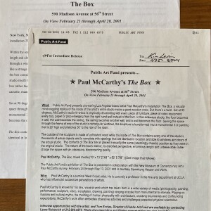 (Paul McCarthy). Public Art Fund presents… Paul McCarthy’s The Box. 500 Madison Avenue at 56th Street, [New York City], February 21 – April 20, 2001