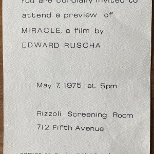 (Edward Ruscha). You are cordially invited to attend a preview of Miracle, a film by Edward Ruscha. Rizzoli Screening Room, 712 Fifth Avenue, [New York], May 7, 1975