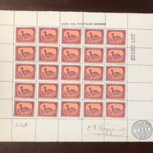 E. F. Higgins III. Doo-da Postage Works. Linocut image on perforated watercolor paper. February 16, 1981