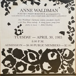 (Anne Waldman). Anne Waldman. Poetry Performance accompanied by saxophone player and composer Gretchen Langheld. Ward-Nasse Gallery, New York, April 30, 1985
