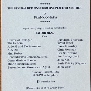 Frank O’Hara. The General Returns from One Place to Another. A just barely staged reading directed by Taylor Mead. 55 Bleecker Gallery, New York, 1 March 1987