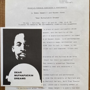 Essex Hemphill. Dear Muthafuckin Dreams. With Tai Johnson, Chris Prince. Visions by Sharon Farmer, Joyce Wellman. Franklin Furnace, New York, April 22-23, [1988]