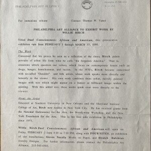 Willie Birch. Duel Consciousness: African and American. Philadelphia Art Alliance, Philadelphia, Pennsylvania, February 3 – March 17, 1990