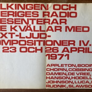Fylkingen. Sveriges Radio presentator Tre Kvällar med text-ljud-kompositioner IV. 21, 23, 25 april 1971.