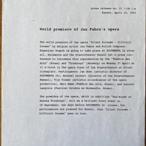 (Jan Fabre). World premiere of Jan Fabre’s opera. Staatstheater Kassel, 27 April 1992