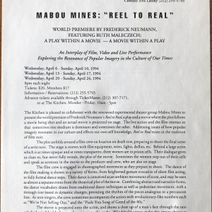 (Mabou Mines). Mabou Mines: “Reel to Real”. World premiere by Frederick Neumann, featuring Ruth Maleczech. A movie within a play. The Kitchen, New York, April 1, 6, 10, 13, 17, 20, 24, 1994
