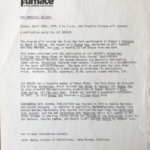 (Lee Breuer)…. publication party for Lee Breuer. Franklin Furnace, New York, April 29, 1979