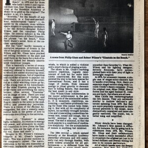 (Robert Wilson). John Rockwell. Music: “Einstein” Returns Briefly. The New York Times, December 17, 1984, page C 13. Clipping.