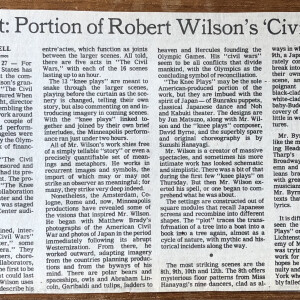 (Robert Wilson). John Rockwell. Pageant: Portion of Robert Wilson’s “Civil Wars”. The New York Times, April 19, 1984. 1 page. Clipping.
