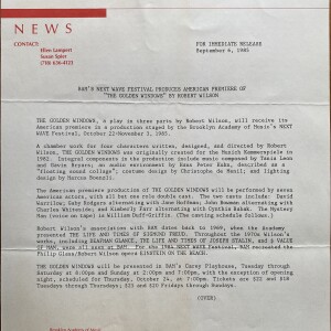 (Robert Wilson). Brooklyn Academy of Music. Brooklyn, New York. Next Wave News. September 6, 1985