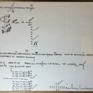 Christopher Knowles / Robert Wilson. “The $ Value of Man.” Written and directed by Christopher Knowles and Robert Wilson. Music by Michael A. Galasso. Brooklyn Academy of Music, Brooklyn, New York, May 8-11, 15-18, [1975]