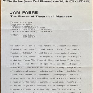 Jan Fabre. The Power of Theatrical Madness. The Kitchen, New York, February 4, 5, 1986