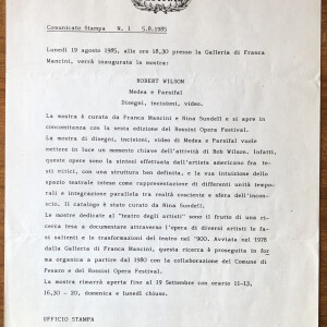 Robert Wilson. Medea e Parsifal. Disegni, incisions, video. Galleria di Franca Mancini, Pesaro, 19 agosto – 19 settembre 1985. (Communicato stampa N. 1, 5. 8. 1985)