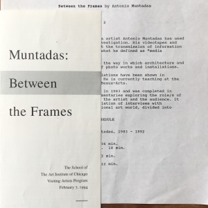 (Antoni Muntadas). Muntadas: Between the Frames. The School of The Art Institute of Chicago, Visiting Artists Program, February 7, 1994 / The Museum of Modern Art, New York, What’s Happening / Video Premieres, February 10, 1994