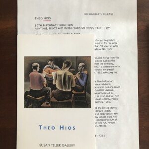 (Theo Hios). Theo Hios. In Honor of the Artist’s 90th Birthday. An Exhibition of Paintings, Prints and Unique Works on Paper, 1937-1994. Susan Teller Gallery, New York, February 6-March 7, 1998