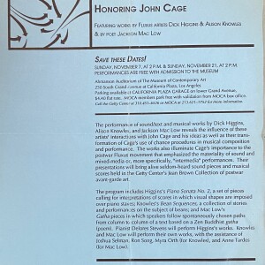 (John Cage). Performance Days. Honoring John Cage. Featuring Works by Fluxus Artists Dick Higgins & Alison Knowles, & by Poet Jackson Mac Low. Ahmanson Auditorium, The Museum of Contemporary Art, Los Angeles, November 7 and 21, [1993]