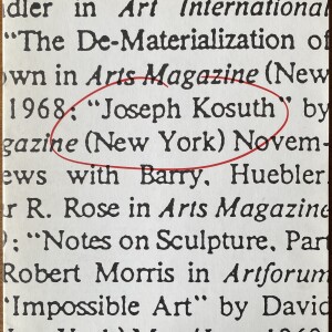 (Joseph Kosuth). Grace Gleuck. At Brooklyn Museum, an Artist Surveys the Objectionable.The New York Times. December 7, 1990. Clipping