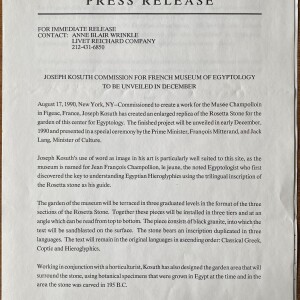 (Joseph Kosuth). Joseph Kosuth Commission For French Museum of Egyptology To Be Unveiled In December, Livet Reichard Company, August 17, 1990