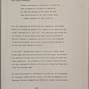 (Kenneth Dewey). News Release Background. Premiere performance of composition for water and light as played by a fire boat as composed by Ken Dewey for occasion of 5th Annual New York Avant Garde Festival on the Staten Island ferry. September 29, 1967