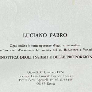 Luciano Fabro. Sinottica degli insieme e della proporzioni. Sperone Gian Enzo & Fischer Konrad, Roma, 31 gennaio 1974