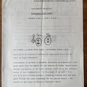Charlemagne Palestine. Continuous Sound Forms. Sonnabend Gallery, New York, January 4 and 5, 1974