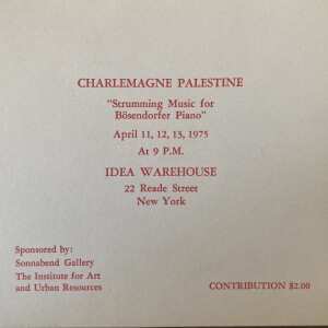 Charlemagne Palestine. “Strumming Music for Bösendorfer Piano”. Idea Warehouse, New York, April 11, 12, 13, 1975