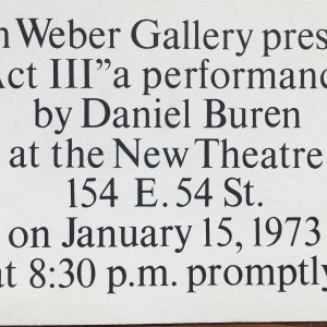 (Daniel Buren). John Weber Gallery presents “Act III” a performance by Daniel Buren at the New Theatre, 154 E. 54th St., [New York], on January 15, 1973