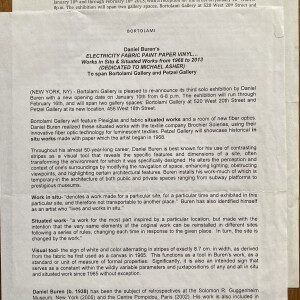 (Daniel Buren). Daniel Buren’s Electricity Fabric Paint Paper Vinyl… Works in Situ and Situated Works from 1968 to 2013 (Dedicated to Michael Asher). To span Bortolami Gallery and Petzel Gallery. January 10 – February 16, [2013]