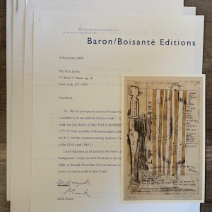 Anton Heyboer. Selected Works of 1957-1980. Baron/Boisante, New York, 3 November – 19 December 1998. 5 items -Announcement card. 6 ½ x 4 ½” / 16.5 x 10.8 cm -Typed letter, signed, from Mark Baron to a contemporary art critic. 6 November 1998. 1 page -1-page press release -Biographic note and exhibitions. 3 pages(=sheets) -Jules Farber. Perpetual Light. 6 pages (=sheets). Reprinted from ARTnews, February 1979