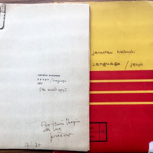 Jarosław Kozłowski: Jezyk/Language. 1972. Typescript. Title sheet + 43 pages (= sheets) held together with a metal paper clip