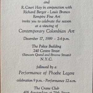 (Phoebe Legere). Contemporary Columbia Art, The Police Building, New York, December 17, 1989, followed by a Performance of Phoebe Legere, The Crane Club, New York
