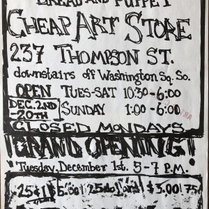 (Bread & Puppet). Bread and Puppet Cheap Art Store. 237 Thompson St., [New York City], December 2 – 20, [1987]