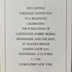 (Robert Morris). Leo Castelli invites you to a reception celebrating the publication of Labyrinths: Robert Morris, Minimalism, and the 1960’s by Maurice Berger. 25 October [1989]… 578 Broadway, New York