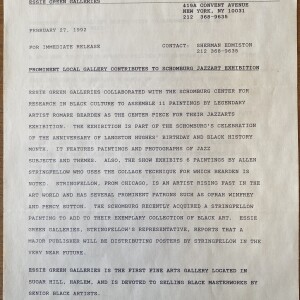 (Romare Bearden). Essie Green Galleries. Prominent local gallery contributed to Schaumburg Jazzart exhibition. February 27, 1992
