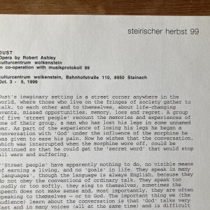 (Robert Ashley). Dust. Opera by Robert Ashley. Cultur Centrum, Wolkenstein, Stainach, October 3 – 5, 1999
