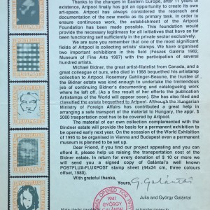 Julia and György Galántai. 1-page form letter, Budapest, 25 September 1990, signed in pencil by György Galántai. Illustrated with 5 of his Post flux stamps and hand stamp