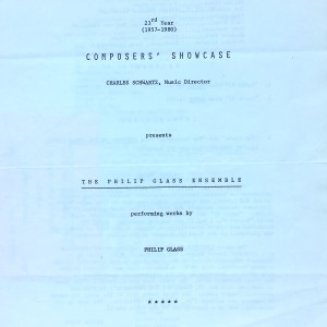 (Philip Glass). Composer’s Showcase, Charles Schwartz, Musical Director, presents The Philip Glass Ensemble, performing works by Philip Glass. Whitney Museum of American Art, January 23, 1980