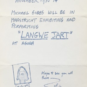 (Michael Gibbs). Michael Gibbs will be in Maastricht exhibiting and performing “Langwe jart” at Agora. Agora Studio Maastricht, November 17 – 30, 1974