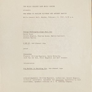 (Pauline Oliveros, Anthony Martin). Mills College Tape Music Center presents New Works by Pauline Oliveros and Anthony Martin