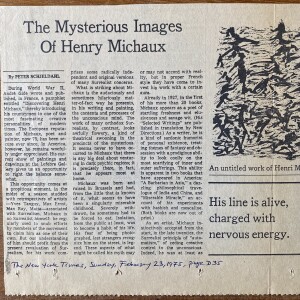 (Henri Michaux). Peter Sjeldahl. The Mysterious Images of Henry [sic] Michaux. The New York Times. February 23, 1975. Clipping