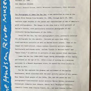 (James Van Der Zee). The Photography of James Van Der Zee. The Hudson River Museum, Yonkers, New York, December 14, 1986 – April 19, 1987