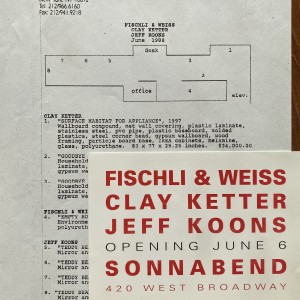 (Fischli & Weiss, Clay Ketter, Jeff Koons). Fischli & Weiss, Clay Ketter, Jeff Koons. Sonnabend, [New York]. Opening June 6, [1998]
