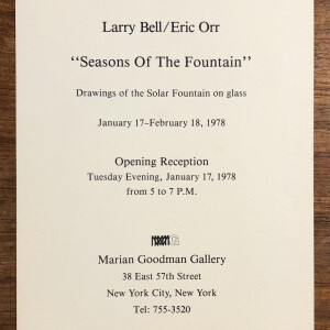 Larry Bell / Eric Orr. “Seasons of the Fountain”/ Marian Goodman Gallery, New York, January 17 – February 18, 1978