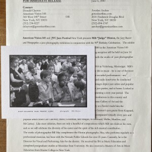 (Milt Hinton). Milt “The Judge” Hinton: A Memorial Exhibition of His Jazz Photographs, 1938 – 1986. Sidney Mishkin Gallery, Baruch College, New York, November 5, 6 – December 11, 2001