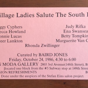 “East Village Ladies Salute the South Bronx”. Curated by Baird Jones. Fashion Moda Gallery, Bronx, New York, October 21, 1986