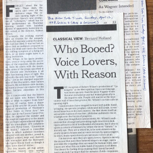 (Robert Wilson). Albert Innaurato. At the Met, Some Are Sure to Boo the New. The New York Times. March 29, 1998, pages AR 41, 42 AR. Clipping.