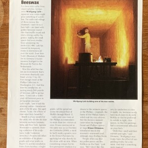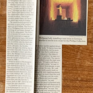 (Wolfgang Laib). Carol Vogel. Inside Art. The Phillips Commissions Wolfgang Laib War Room. The New York Times, July 20, 2012, page C20. Clipping.